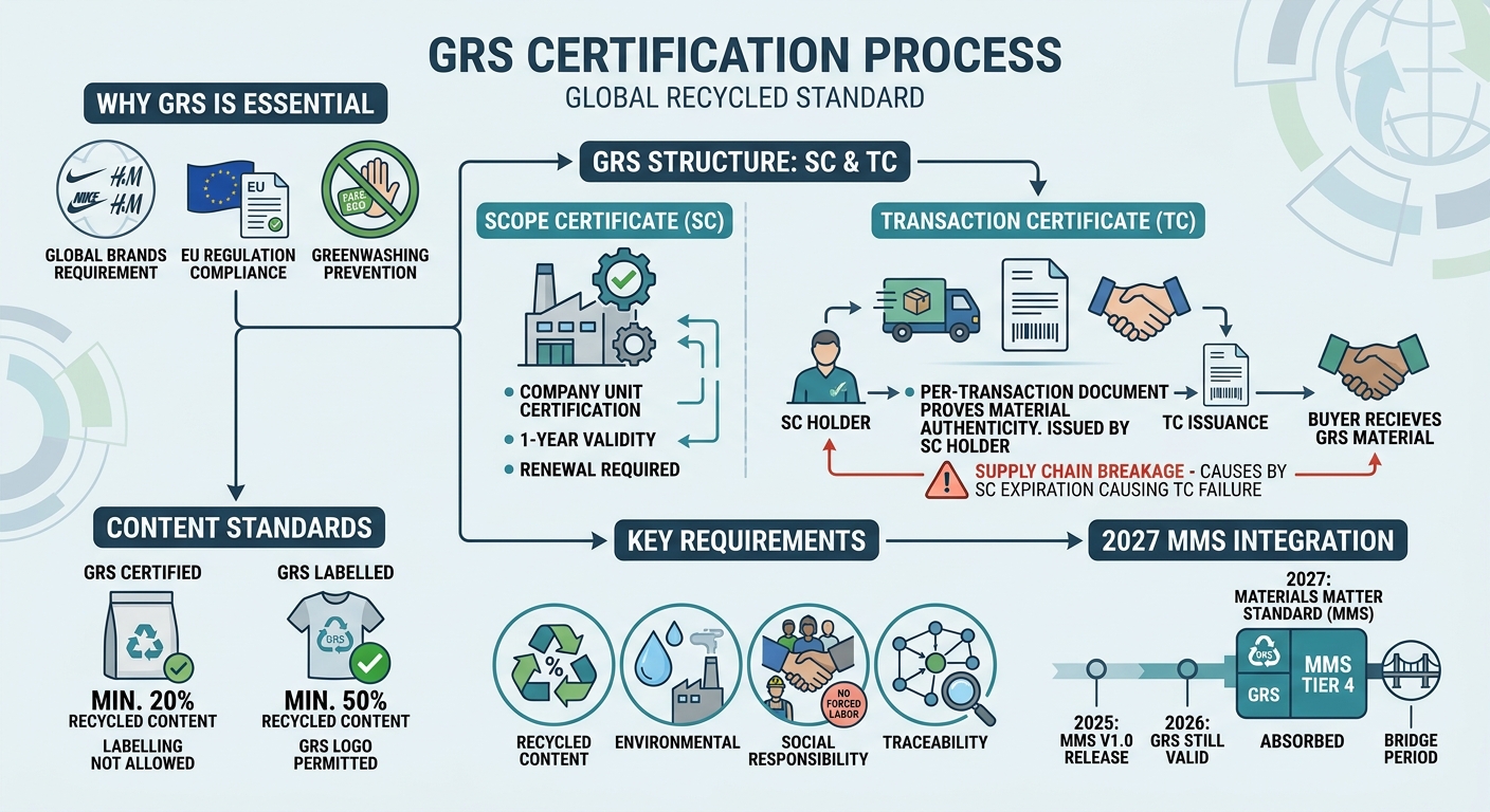 GRS(Global Recycled Standard) 인증의 구조(SC·TC), 함량 기준, 신청 절차, 비용($5,000~$15,000), 2027년 MMS 통합 전환 일정까지 재활용 플라스틱 실무자를 위한 핵심 가이드입니다.